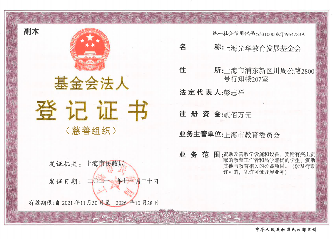 上海光华教育发展基金会,致力于联合各界公益力量,践行社会责任,资助教育项目,推动中国教育创新发展。基金会以光耀中华为使命,立足当下,在深耕教育行业的基础上创新进取,播下希望的种子,让光荣与梦想生根发芽、开花结果。